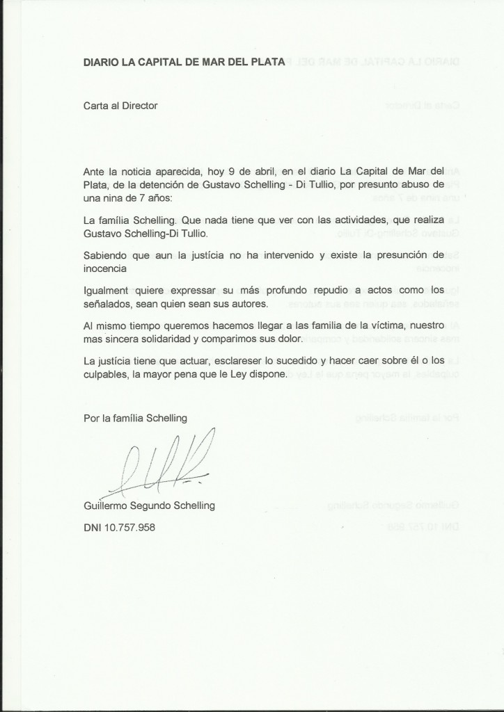 Ante esta situación, hoy un sector la familia Schelling envió la siguiente carta a LA CAPITAL. “Ante la noticia aparecida en el diario La Capital de Mar del Plata de la detención de Gustavo Schelling- Di Tullio por presunto abuso de una niña de 7 años. La familia Schelling. Que nada tiene que ver con las actividades, que realiza Gustavo Schelling- Di Tullio. Sabiendo que aún la justicia no ha intervenido y existe la presunción de inocencia.