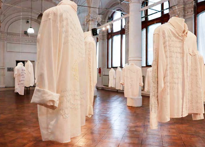 Las camisas blancas son el soporte de escrituras hilvanadas que resisten y que entrelazan temporalidades, trayendo al presente las palabras de Eva. Esas palabras siguen iluminando porque portan su indignación ante la injusticia social, su pasión por la igualdad de derechos y su amor a los humildes.