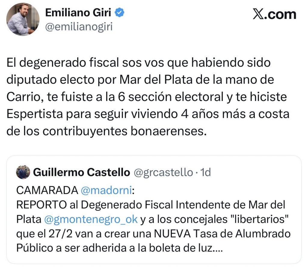 La polémica se activó a partir de la plataforma nacional lanzada por el jefe de Gabinete, Manuel Adorni, quien invitó a los ciudadanos a “reportar” tasas municipales. En ese contexto, Castello utilizó la herramienta para denunciar al intendente y a los concejales que acompañarán la iniciativa, alineando su postura con el discurso nacional del presidente Javier Milei contra la presión impositiva. El legislador habló de “voracidad fiscal” y utilizó el término “degenerado fiscal” para referirse al jefe comunal, en un tono que rápidamente elevó la tensión política local. La respuesta de Giri no tardó en llegar. Desde la misma red social, acusó a Castello de oportunismo político y cuestionó su recorrido partidario, recordando que fue electo en su momento con el espacio de Elisa Carrió y luego cambió de alineamiento político. “El degenerado fiscal sos vos”, replicó, en un mensaje que dejó en evidencia la fractura discursiva dentro del mismo universo ideológico.