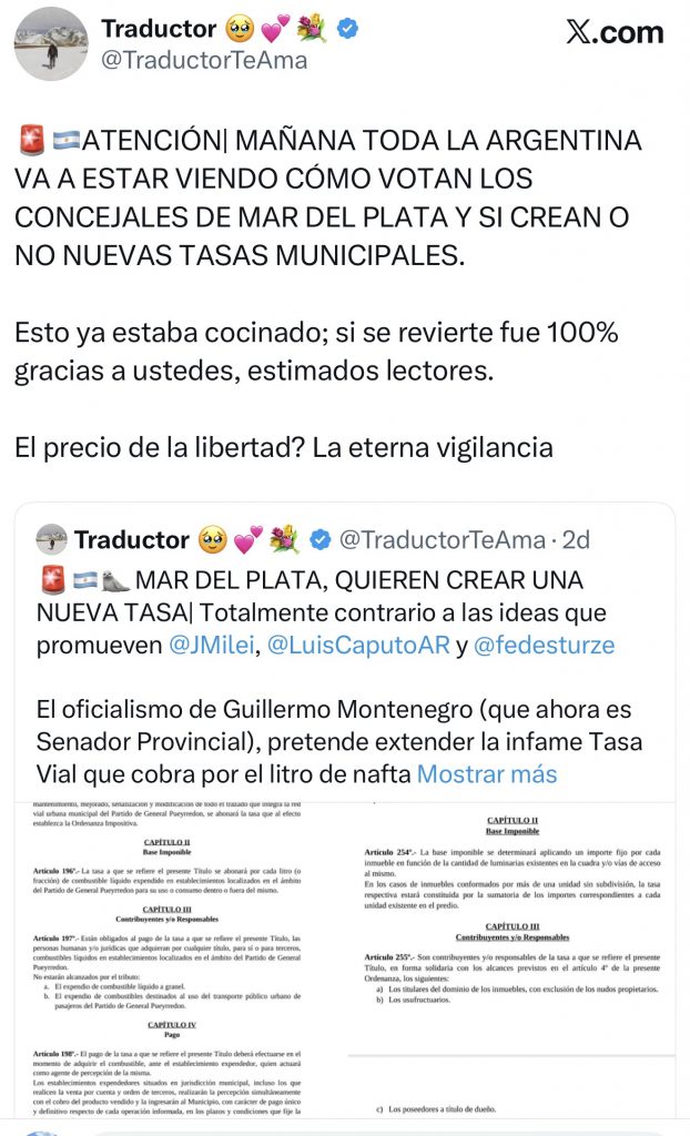 Y hubo nuevos capítulos de presiones previas en redes sociales. La sesión de mañana en el Concejo Deliberante de Mar del Plata no solo viene caliente por el aumento de tasas y la discusión por la tasa vial. En las últimas horas, la presión empezó a sentirse fuerte en redes sociales, donde el ala libertaria más dura salió a marcar la cancha. Un posteo viral advirtió que “toda la Argentina va a estar viendo cómo votan los concejales” y planteó que avanzar con nuevas tasas municipales sería ir en contra de las ideas que promueven a nivel nacional figuras como Javier Milei y Luis Caputo. El mensaje habló incluso de “eterna vigilancia” y dejó flotando que la votación ya estaba “cocinada”. Pero detrás de ese mensaje, hay una interna que no es nueva. El usuario @traductorteama con 283 mil seguidores en X, y al que muchos identifican como Esteban Glavinich, mantiene desde hace tiempo un enfrentamiento con Sebastián Pareja, uno de los principales armadores libertarios en la provincia. No es solo una diferencia táctica: es una disputa por conducción, territorio y pureza ideológica dentro del espacio.