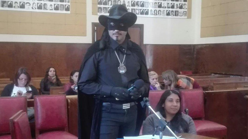 El jueves 23 de mayo de 2019, el hombre aguardó por dos horas para ingresar al recinto. Preguntó dónde estaba el baño en el Palacio Comunal y, minutos antes de que le toque ser llamado a exponer, apareció disfrazado de “El Zorro”. Los presentes quedaron entonces desconcertados.