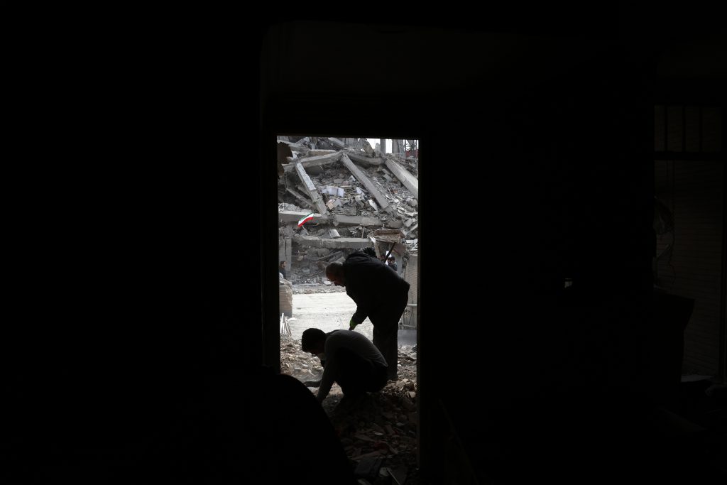 Iraníes recogen sus pertenencias entre los escombros de sus edificios residenciales dañados en el centro de Teherán, Irán. Foto: EFE | Abedin Taherkenareh.