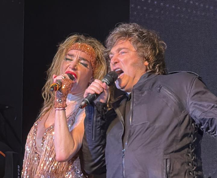 Tal como había hecho en 2024, a poco de haber asumido, el presidente cumplió un doble objetivo: acompañó a su ex pareja y se dio el gusto de volver a subirse a un escenario para cantar.
