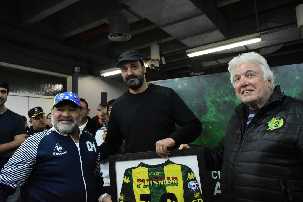 Josesito junto a su padre y Diego Maradona, cuando enfrentó a Aldosivi como entrenador de Gimnasia.