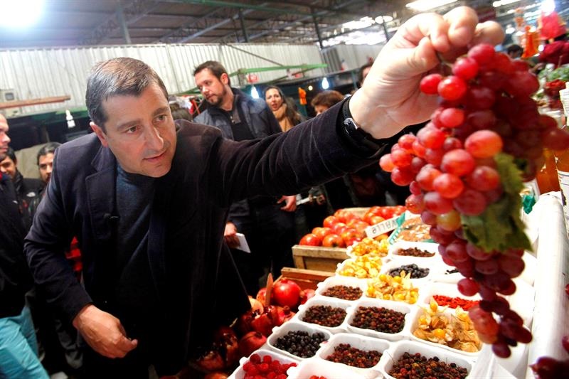 Josep Roca sostiene un racimo de uvas durante su visita a la Vega Central, en Santiago. Foto: EFE.