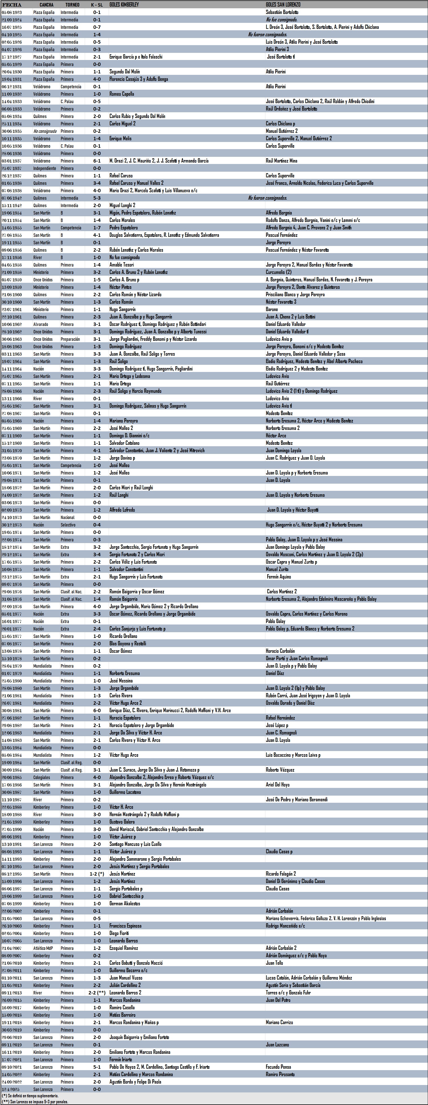 La mayor goleada en un clásico fue un 7-0 de San Lorenzo, en 1925. Treinta años después, logró un 7-1. La victoria más abultada de Kimberley fue un 6-0, en 1981, torneo ganado por su clásico rival. Antes había logrado un 6-1 en 1937 (torneo de 1936). San Lorenzo se impuso tres veces 5-0: en 1926, 1933 y 2003.