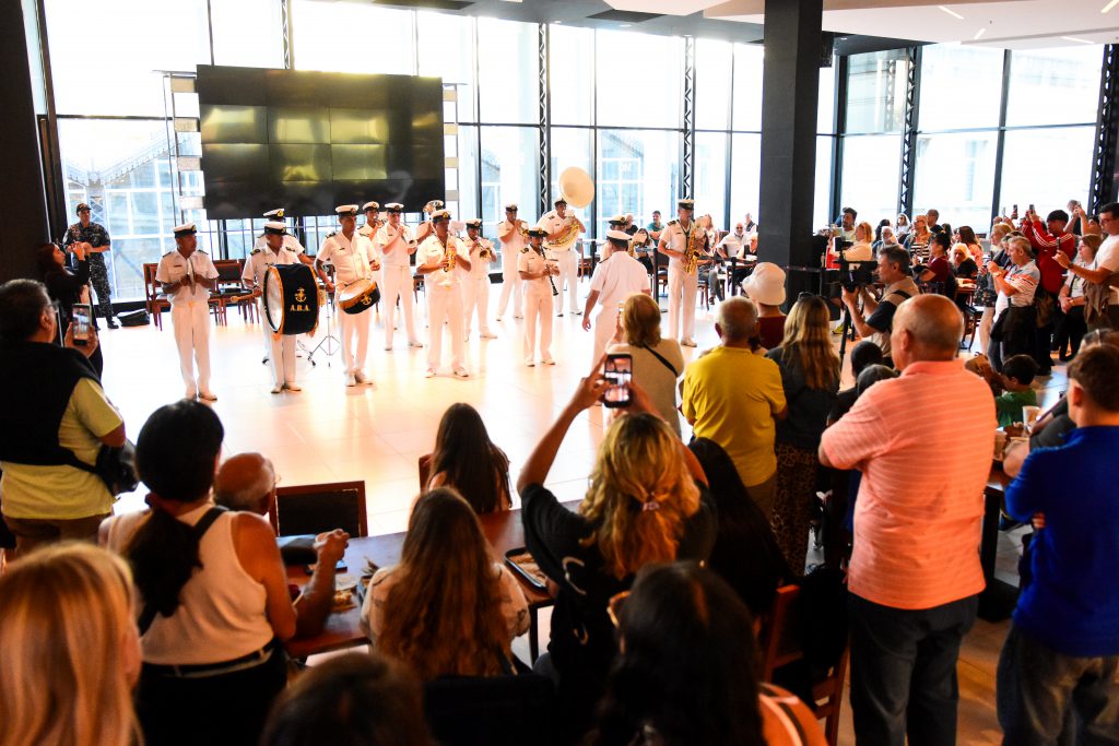 Los músicos, dirigidos por el teniente de fragata Marcos Vicente Ezequiel Rodríguez, deleitaron y sorprendieron a los marplatenses y turistas que merendaban en el patio gastronómico del centro comercial y a los paseantes ocasionales.