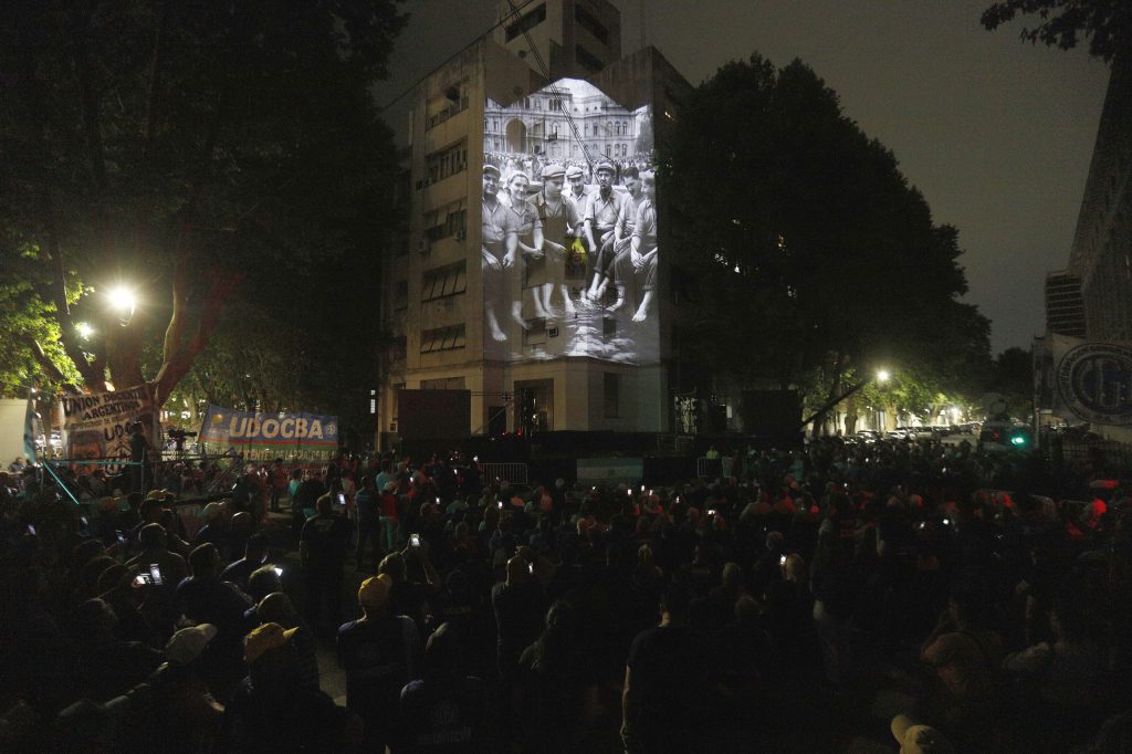 Cuando se comenzó a hacer de noche llegó el momento central del acto, ya que se realizó una extensa proyección de mapping en la fachada del edificio de la calle Azopardo, con videos de Perón, que fue seguida por afiliados de distintos gremios de la central, sobre todo de la UOCRA y UPCN.