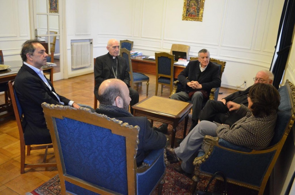 Gioja y Scioli, presidente y vicepresidente del PJ, concurrieron a la sede episcopal acompañados por los gobernadores Lucía Corpacci, de Catamarca, y Gildo Isfrán, de Formosa.