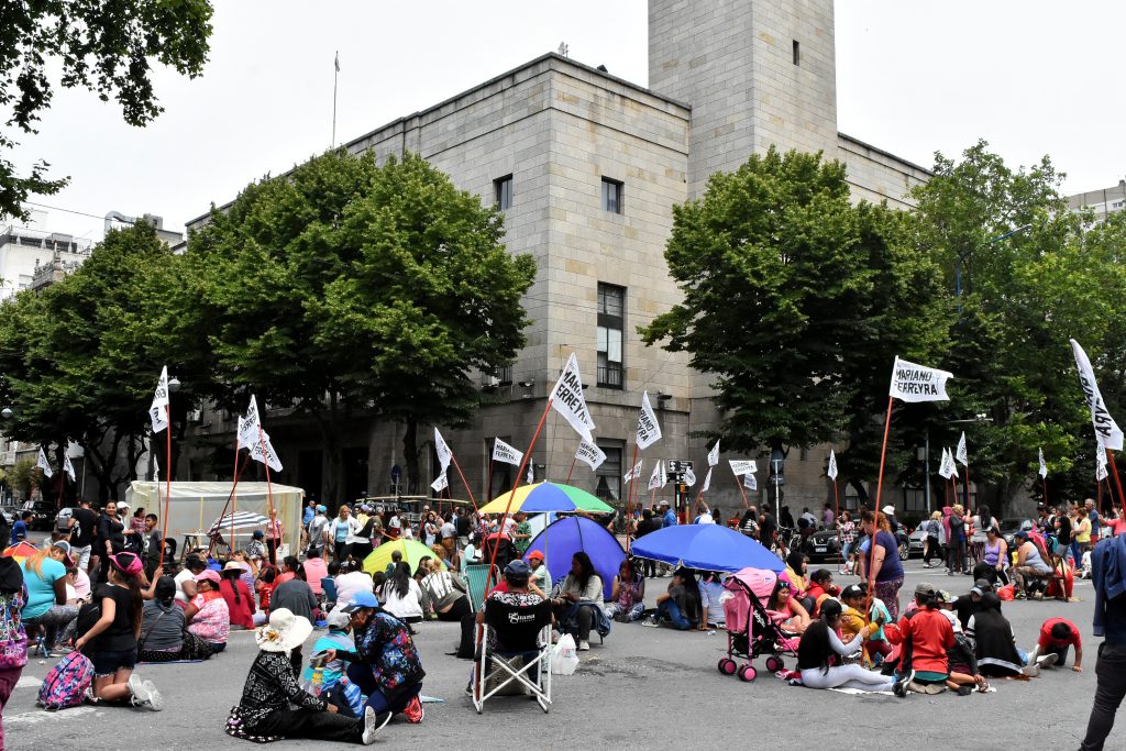 MOVILIZACIÓN. La agrupación barrial Mariano Ferreyra protestó en reclamo de trabajo genuino y del incremento de mercadería que entregan la Nación, la Provincia y el Municipio, este lunes 13 de enero frente a la Municipalidad de Mar del Plata. A su vez, exigieron que se aumenten los montos de los programas sociales. FOTO. Osvaldo Braillard | Diario La Capital de Mar del Plata.