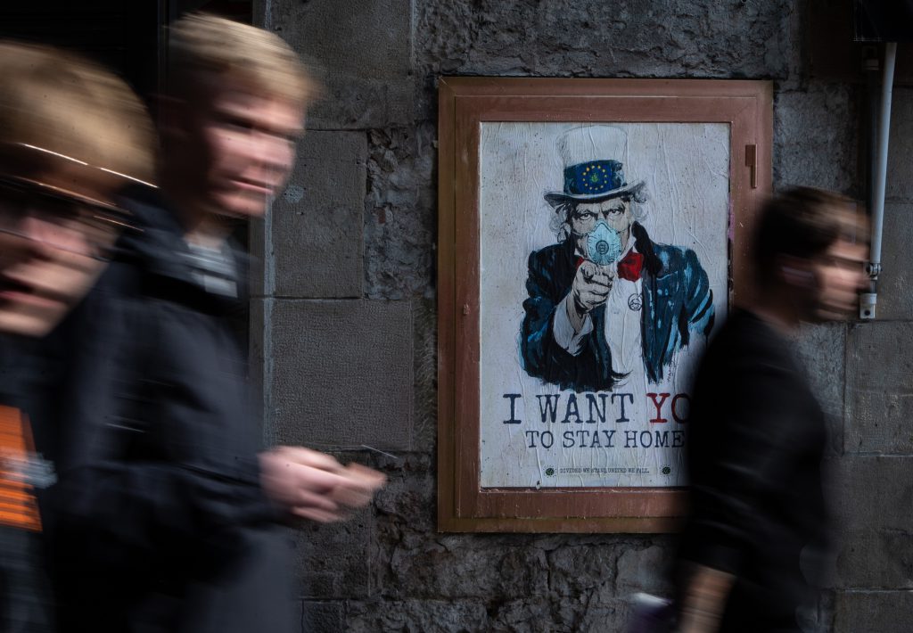 “I WANT YOU TO STAY HOME”. El artista urbano TVBoy utilizó el icónico cartel del Tío Sam (implementado para reclutar soldados en la Primera Guerra Mundial) para hacer un llamamiento a permanecer en casa durante la crisis del coronavirus. La obra apareció este viernes 13 de marzo en el centro de Barcelona. FOTO: Enric Fontcuberta | EFE.