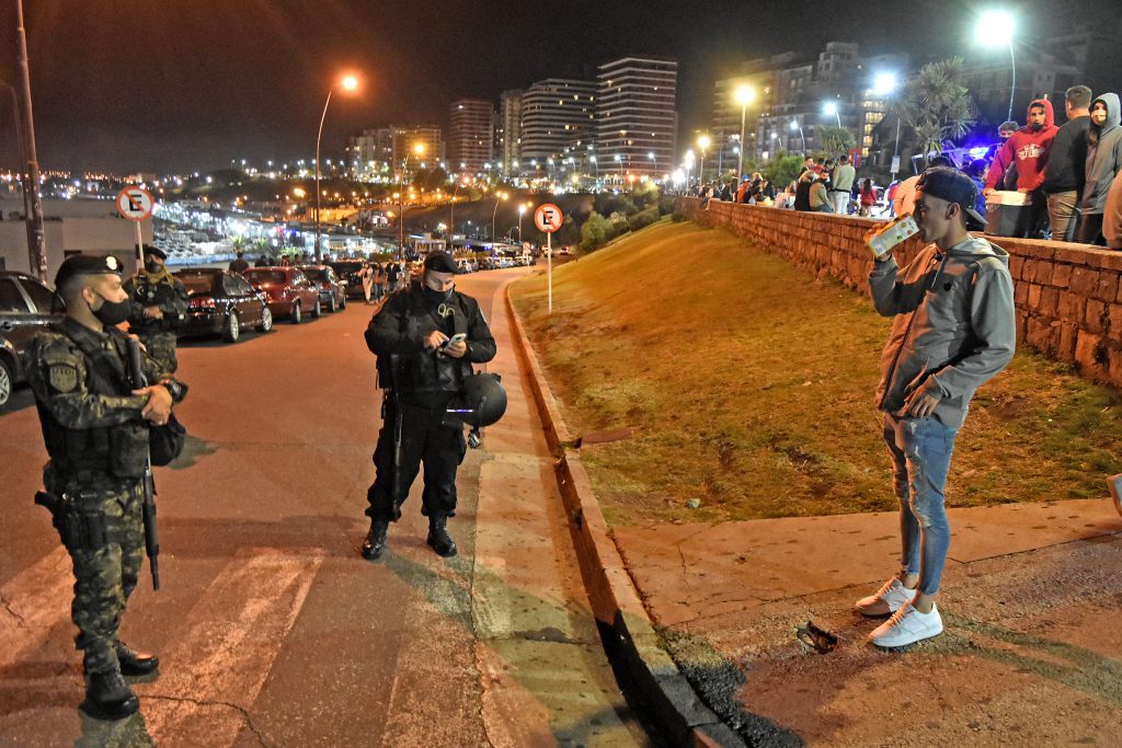 FIN DE AÑO. Un joven celebra la llegada del 2021 tomando en envase tetrabrik frente a tres efectivos policiales que controlan los festejos de los marplatenses en la costa, en la zona de Playa Grande, este viernes 1 de enero a la madrugada. FOTO: Mauricio Arduin | Diario La Capital de Mar del Plata.