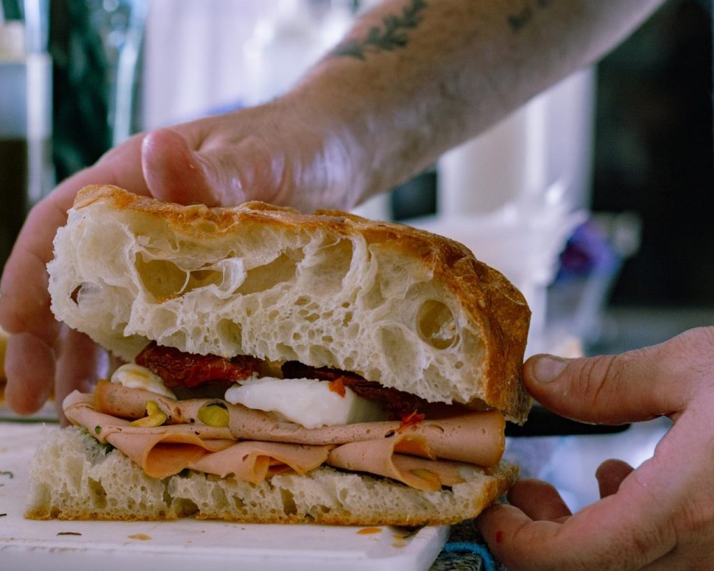 Una vez tomado el espacio, el equipo inició el trabajo desde cero. Durante tres meses realizaron pruebas para definir la focaccia que querían ofrecer. El objetivo era lograr un pan con la altura y la textura adecuadas para sostener un sándwich sin perder identidad. El proceso incluyó ensayos diarios, primero a mano y luego con la incorporación de maquinaria, lo que obligó a ajustar la receta original.