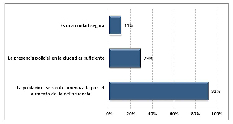 Un 92 por ciento de los encuestados marcó a la inseguridad como el principal problema de la ciudad muy por encima de otros temas. En segundo orden se ubicó el desempleo, con un 56 por ciento, seguido por la salud, con un 49 por ciento, y la educación, 42 por ciento.