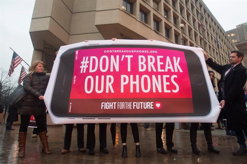 Simpatizantes de Apple sostienen un cartel que dice "No rompan nuestros teléfonos" en rechazo a la iniciativa del FBI. Foto: EFE.