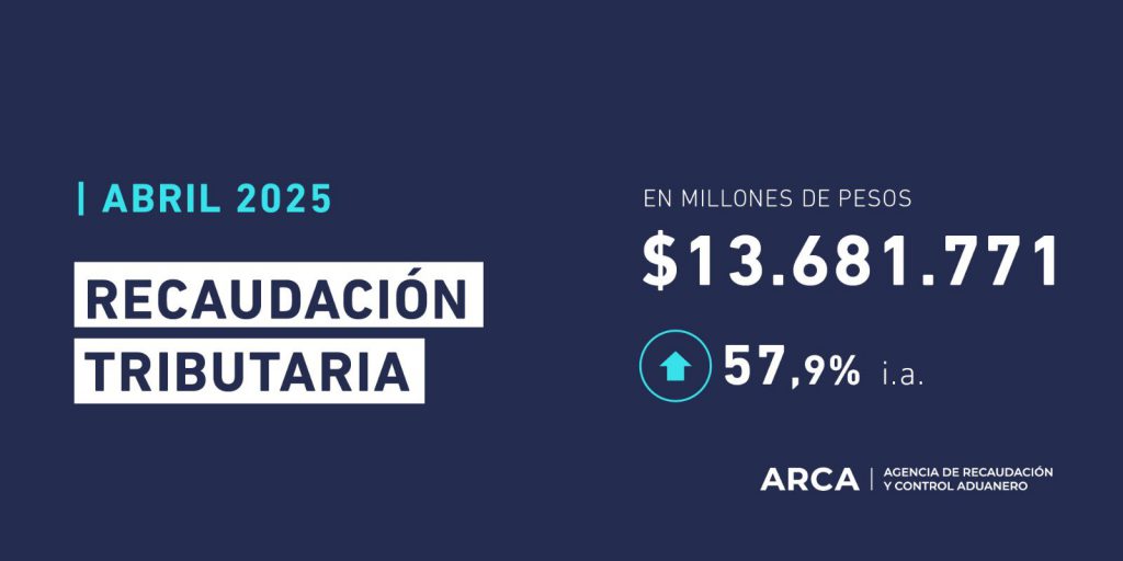 La recaudación tributaria ascendió en abril pasado a 13.681.771 millones de pesos (unos 11.239 millones de dólares), lo que representó un alza del 57,9 % en comparación con igual mes de 2024, informaron fuentes oficiales.