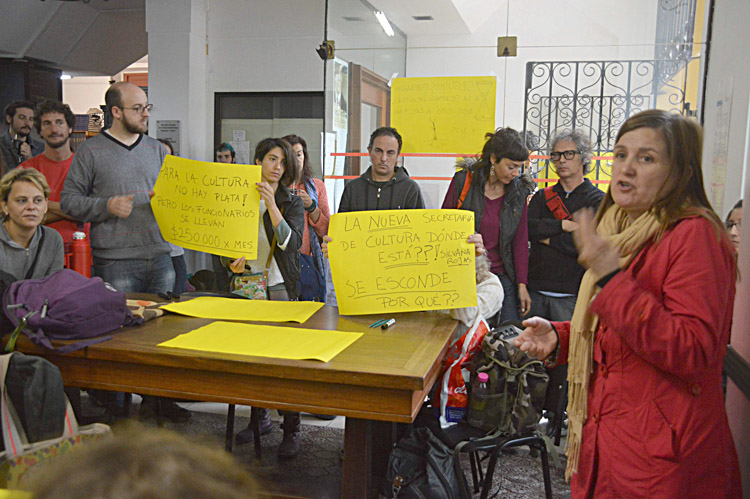 Entre quienes protestan se encuentra el elenco de la Comedia Municipal, que reclama que se le paguen los salarios adeudados desde octubre, integrantes del programa Escenarios Andantes -en situación similar-, elencos de la Feria del Libro Infantil y Juvenil -a los que se les debe desde 2014- y capacitadores que además de reclamar el pago de haberes, piden su continuidad laboral.