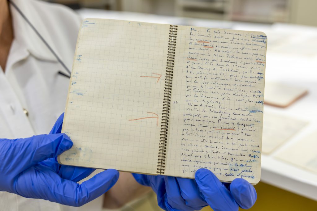 Paule Hochuli Dubuis, conservadora de manuscritos y archivos privados de la Biblioteca de Ginebra, muestra una de las agendas de notas de Ella Maillart. Foto: EFE | EPA | Salvatore Di Nolfi.
