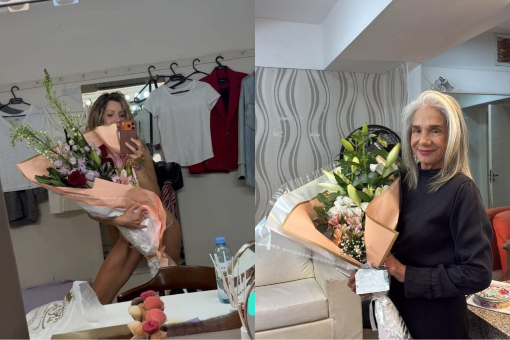 Laurita Fernández recibió flores en su camarín tras la función de “La cena de los tontos”.