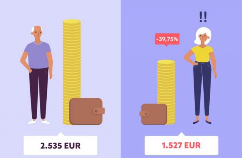 Así, la diferencia entre la pensión bruta mensual promedio de mujeres y hombres es del 39,7 %, la tercera brecha más alta de la Unión Europea, solo por debajo de Países Bajos y Malta, mientras que la media comunitaria es del 24,7 %.