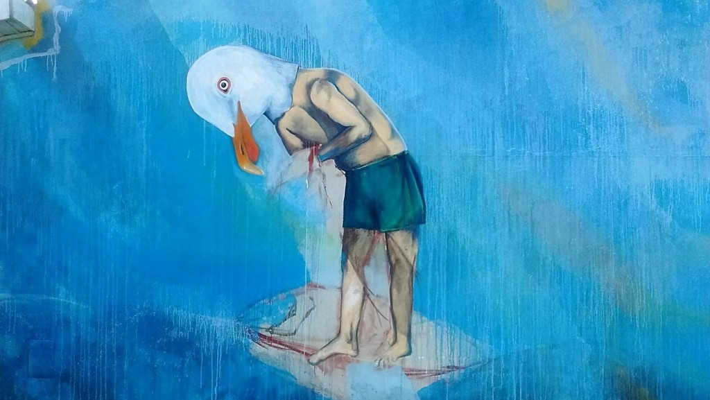 “Es un personaje que tiene cuerpo humano con cabeza de gaviota, tiene esta cabeza porque nace en el puerto, tiene también un shortsito verde y amarillo porque es de Aldosivi. Lo que hace este personaje es mostrarnos el camino para cumplir nuestros sueños” explicó el artista urbano.