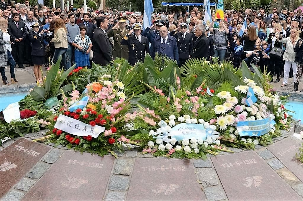 El jefe comunal estuvo acompañado por el presidente del Centro de Ex Soldados Combatientes en Malvinas Gustavo Schroeder y representantes de la Agrupación de Veteranos de Guerra del Atlántico Sur, el Centro de Civiles Veteranos de Guerra Operativo Malvinas, la Agrupación de Veteranos Defensores de Malvinas y el Departamento de Veterano de Guerra de la Prefectura, además de familiares de combatientes y representantes de las Fuerzas Armadas.