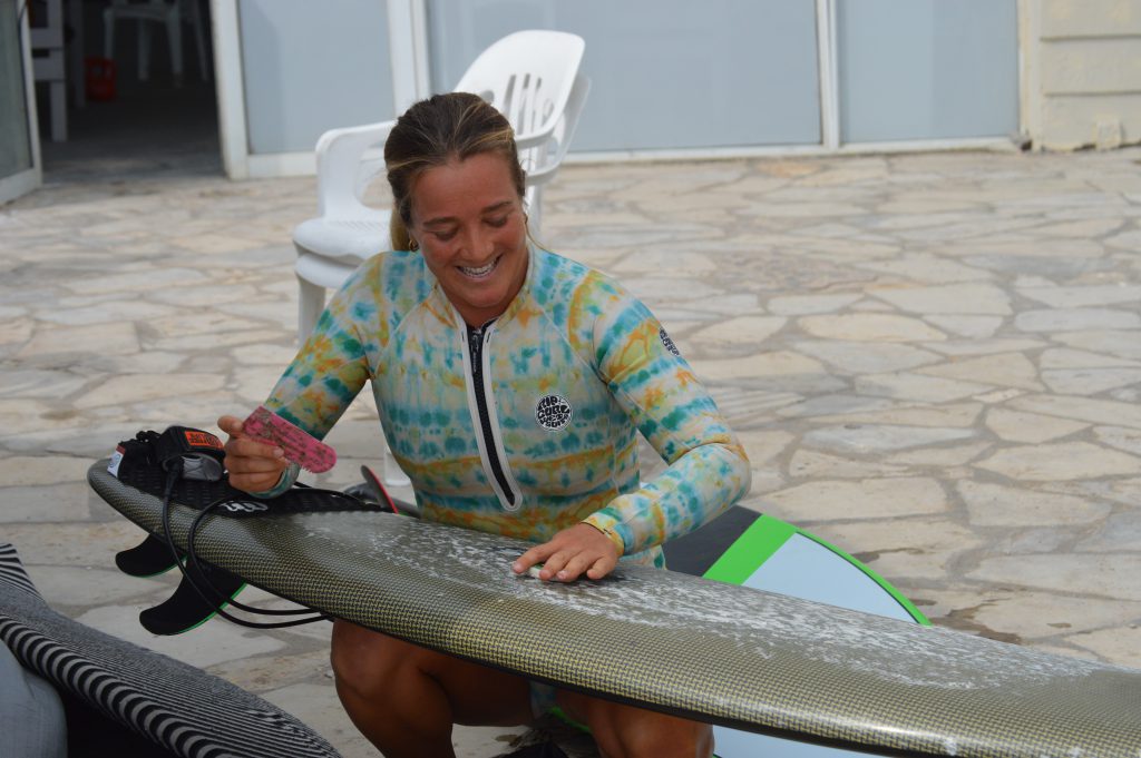 Lucía Cosoleto preparando su tabla antes de ingresar al agua para competir.