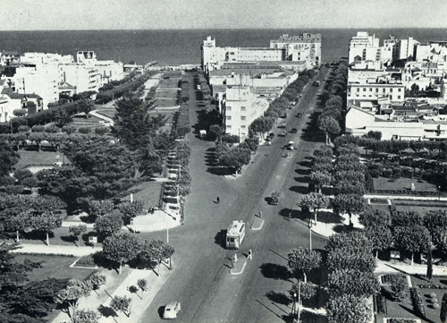 Esta panorámica de Avenida Luro fue tomada en la década del 40 desde lo alto de la torre de la Municipalidad. Un tranvía eléctrico de los que hubo en Mar del Plata hasta la década del 50 transita hacia la costa al igual que varios vehículos. Debe tenerse en cuenta que hasta 1945 la mano de circulación era inversa a la de hoy y que los vehículos tenían el volante a la usanza inglesa.