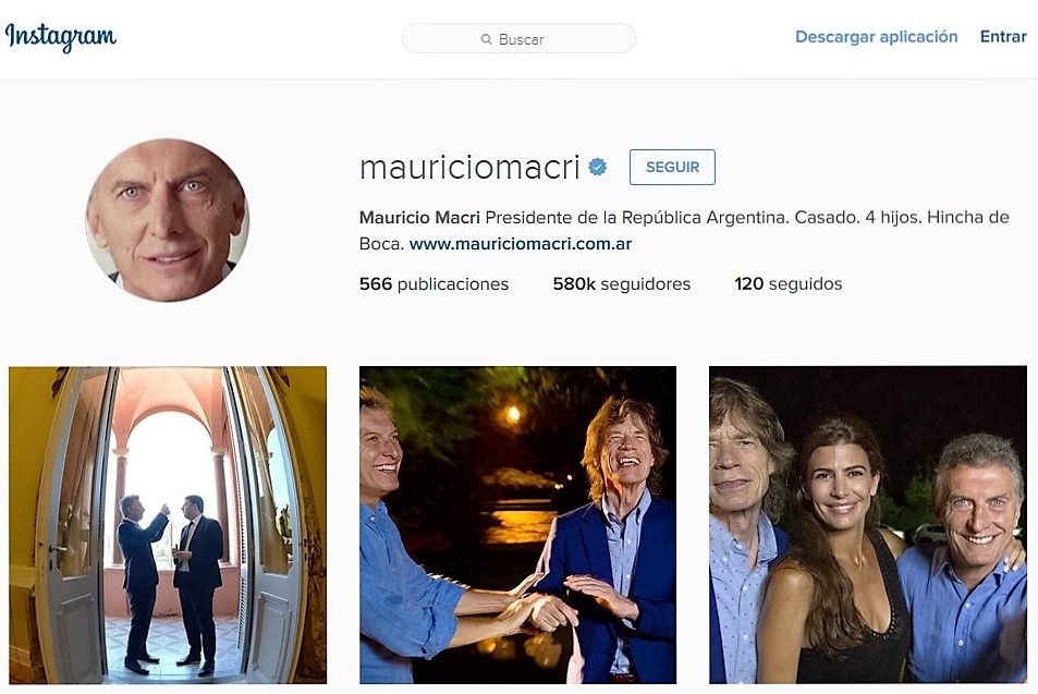 El presidente de Argentina, Mauricio Macri, es el gobernante más popular de Latinoamérica en Instagram, con 580.000 seguidores, seguido de los mandatarios de Brasil, Dilma Rousseff, y Colombia, Juan Manuel Santos, según un estudio sobre la presencia de los Gobiernos en esa red social.