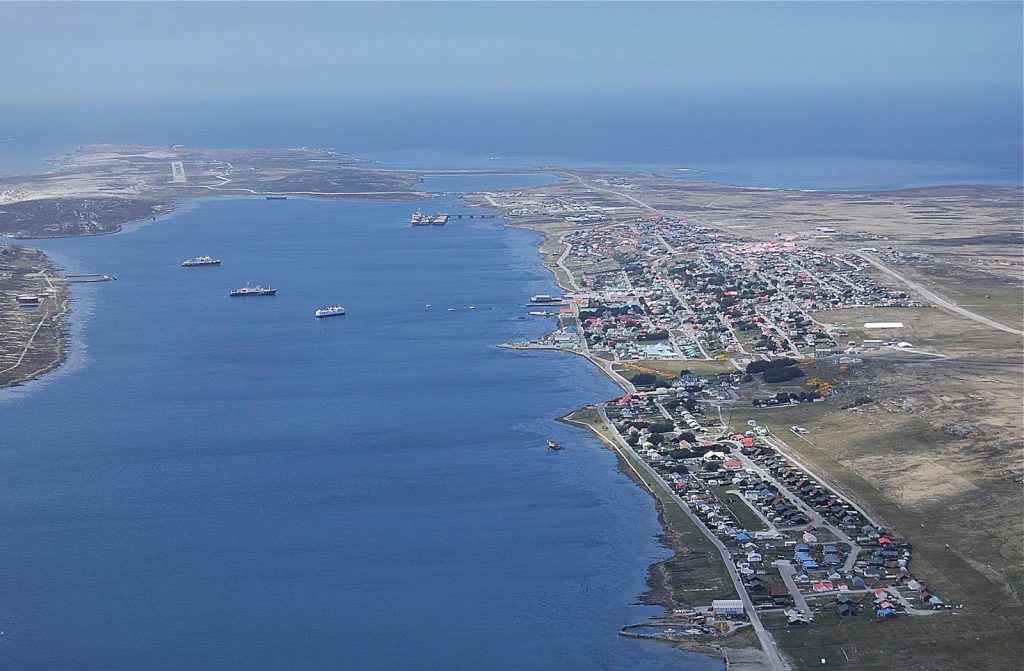 Vista aérea de Puerto Argentino, capital de las Islas Malvinas.