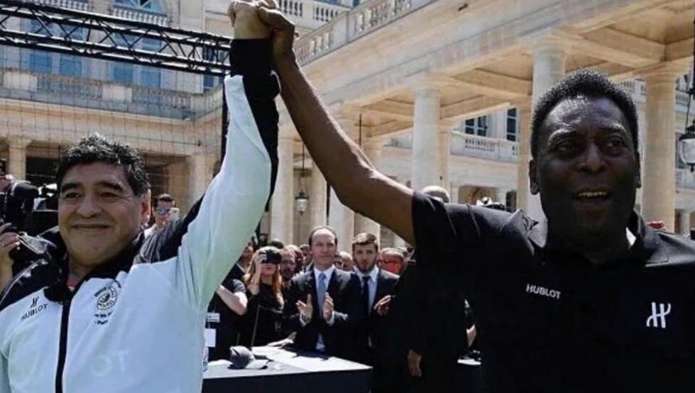 El saludo de dos astros del fútbol, Maradona y Pelé.