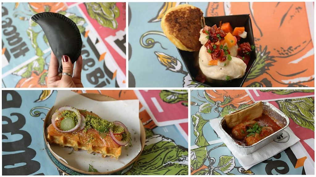 Empanada de ceniza vegetal (Chila), Cachetes de raya en escabeche, pickles de rabanitos y tomates confitados (Sarasanegro), Gravlax de salmón (Los Petersen) y Salcciotto di maiali (Cucina Paradiso). Fotos: Feria Masticar.