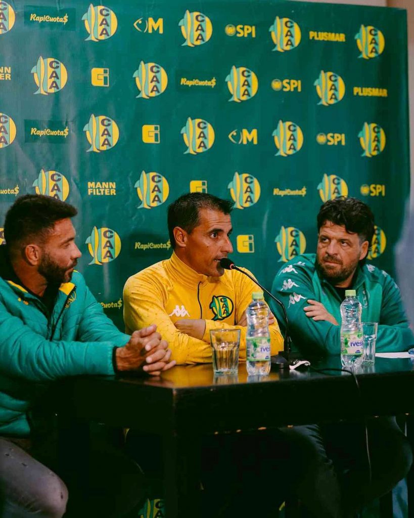 Guillermo Farré, el flamante entrenador de Aldosivi, ofreció su primera conferencia de prensa junto a los dirigentes Adrián Valastro y Hernán Tillous (Foto prensa Aldosivi).