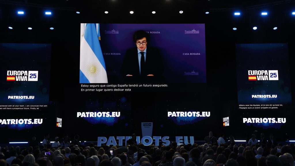 Milei participó por videoconferencia en el gran acto político de cierre de la cumbre ‘Europa Viva 25’, celebrada por el partido ultraderechista español Vox este fin de semana.