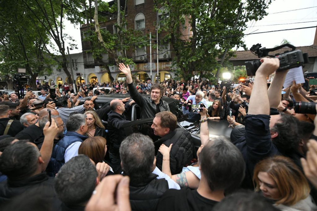 Antes de la llegada de Milei y sus candidatos hubo algunos empujones y corridas entre los militantes libertarios y un reducido grupo de manifestantes que concurrieron a las inmediaciones de la céntrica Plaza de los Aviadores para protestar contra el Presidente, pero la situación no pasó a mayores.
