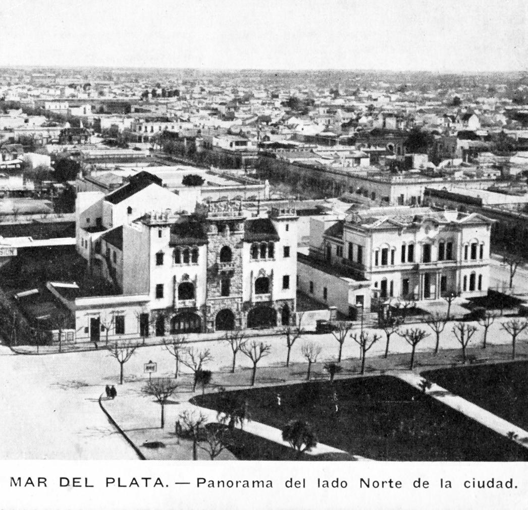 Esta fotografía fue tomada en la década del 20 desde el campanario de la actual Catedral. El edificio que vemos a la derecha no es otro que el antiguo Palacio Municipal, que se hallaba ubicado en el mismo sitio que hoy. Fue levantado en 1889 y lo demolieron en 1938 para la construcción del edificio actual. A su lado vemos al flamante Teatro Colón, que funcionaba allí desde fines del siglo XIX pero en un edificio mucho más precario.