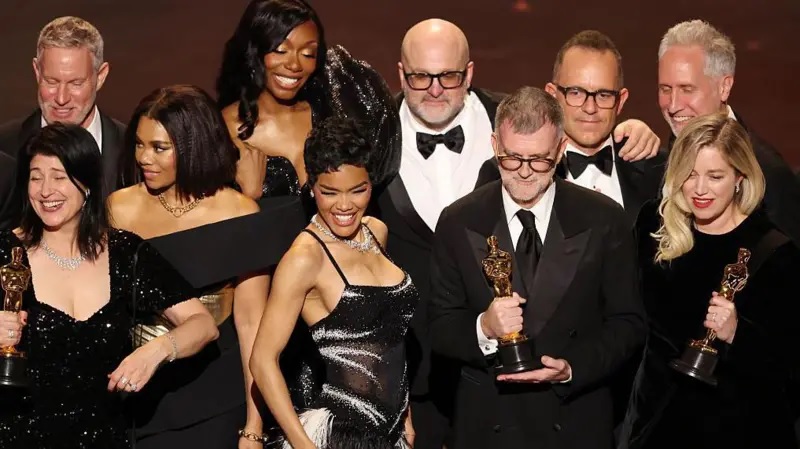 Tras el anuncio, todo el elenco y el equipo de producción subieron al escenario para recibir el el Oscar y celebrar el reconocimiento a una de las producciones más comentadas del año.