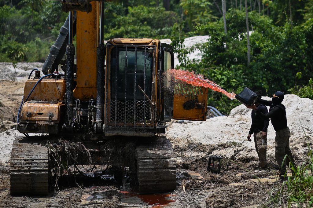 Un agente ambiental federal lanzando combustible a una retro excavadora utilizada para minería ilegal, durante un operativo en la Floresta Ambiental de Altamira, estado de Pará (Brasil). Foto: EFE | Andre Borges | Archivo.