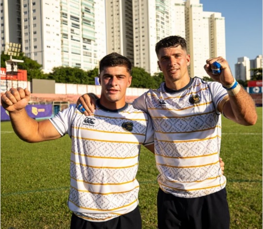 Foto: @pampas_uar El marplatense Ramiro Manzo (un try y el tandilense Ignacio Díaz (dos tries) tuvieron un debut soñado en Pampas.