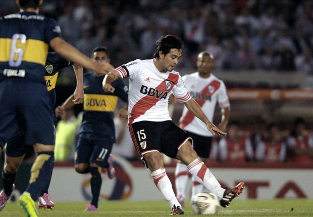 El volante se incorporó a River Plate en 2014, que pagó 500.000 dólares para Argentinos Juniors por su pase y, entre otros títulos obtuvo la Copa Sudamericana 2014 -en la que le convirtió un gol a Boca Juniors en el triunfo por 1 a 0 en la revancha de la semifinal-; la Recopa Sudameircana y la Copa Libertadores 2015.