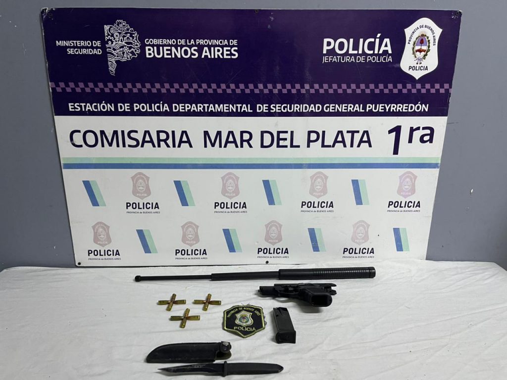 Al identificarlo, los efectivos del Comando de Patrullas y la comisaría primera supieron que el hombre había formado parte de la fuerza y que, tal como lo habían denunciado las víctimas, estaba armado. En su poder, secuestraron una pistola marca Firestorm calibre 9 milímetros, un cuchillo de mango de goma con hoja de metal, una barra de plástico con una punta de metal que al extenderse cuenta con 60 centímetros de largo, y un escudo dorado con la inscripción Policía de la Provincia de Buenos Aires.