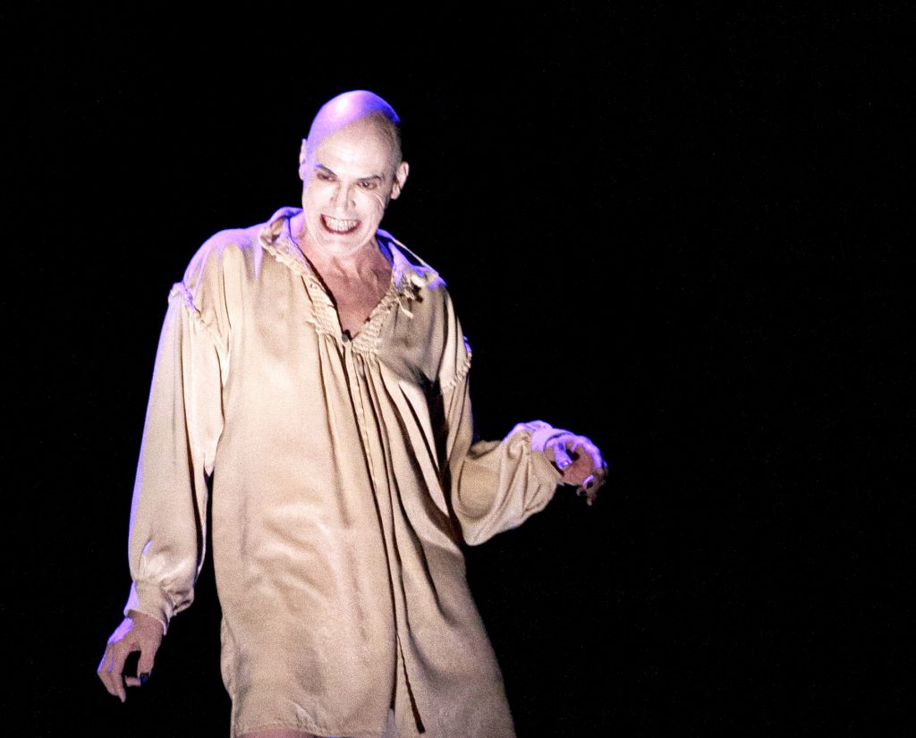 Una camisola juega el rol de vestido, de atuendo de guerra o de caparazón de brujas y deja al descubierto sus piernas torneadas. Unos pocos elementos sobre el escenario: un atril, el marco de un cuadro, un velo, una espada, cuchillos y linternas con las que juega a desfigurarse. Al costado, un músico, Claudio Peña ejecuta el violoncello e interviene, casi al final del espectáculo. Adentro de la camisola color piel, el inmenso Pompeyo Audivert interpreta, al menos, a seis personajes de Macbeth y con su performance nos convence: estamos ante uno de los espectáculos teatrales más descomunales.