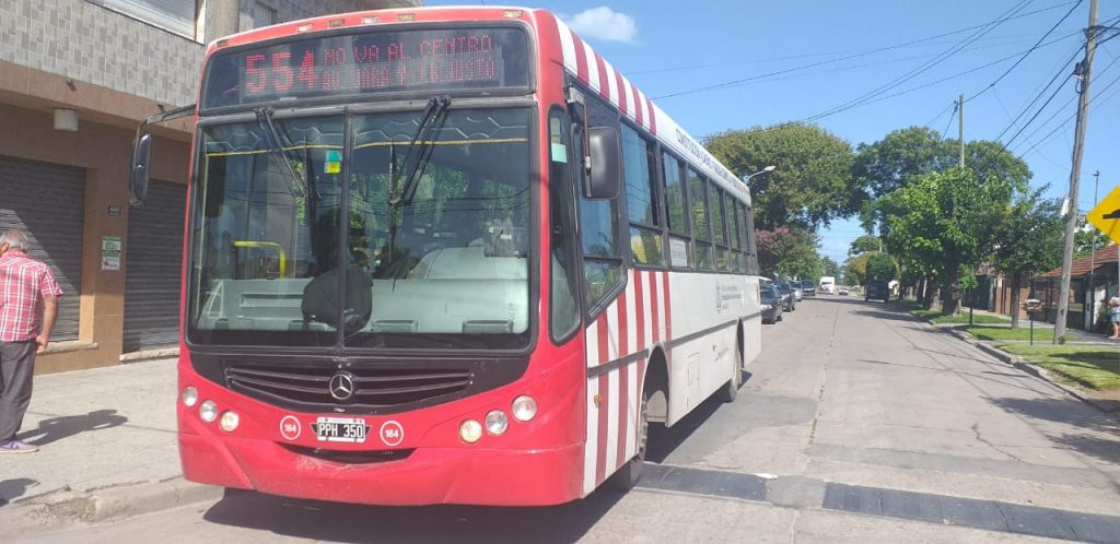 El 553 frena. Bajan cinco personas: un hombre con una bolsa de pan, dos adolescentes con auriculares, una mujer con un bebé dormido y un anciano con bastón. Sube una mujer mayor con un bolso de tela y se acomoda junto al chofer.