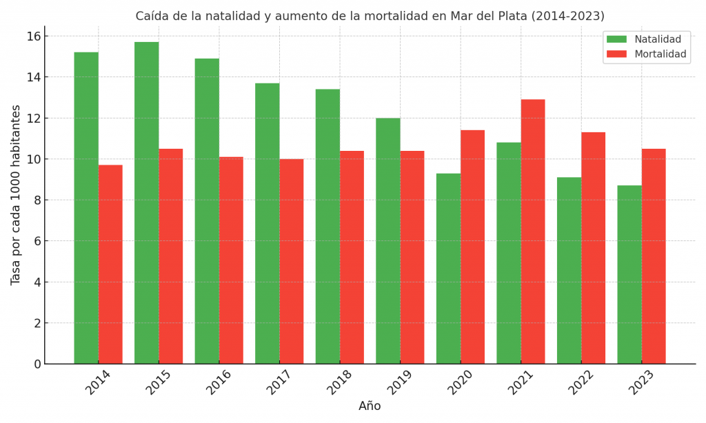 Hay una Mar del Plata que envejece, con menos nacimientos, y un futuro que obliga a repensar la ciudad. Un informe elaborado por el Dr. Germán Santamaría, economista y coordinador técnico de Mar del Plata Entre Todos, lo pone en cifras y contexto: entre 2014 y 2023, la tasa de natalidad en el Partido de General Pueyrredon cayó un 42,9 %. Pasó de 15,2 nacimientos cada mil habitantes a apenas 8,7. Es una caída que no deja lugar a eufemismos: la ciudad está teniendo muchos menos hijos. “La reducción en la natalidad implica que el recambio generacional es cada vez menor”, explica Santamaría. Y esto se traduce, dice, en “una creciente proporción de personas mayores dentro de la estructura demográfica”. Y, como si fuera poco, en el mismo período aumentó un 8,5 % la tasa de mortalidad y la esperanza de vida apenas se estiró un 1,4 %. Con ese cóctel, el resultado es claro: la población envejece, los nacimientos no alcanzan para el recambio generacional y el modelo demográfico tradicional –el que tenía forma de pirámide– empieza a parecerse más a un hongo.