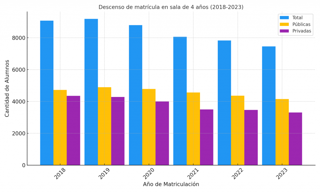 La caída de la natalidad ya tiene un correlato directo en el sistema educativo, especialmente en el nivel inicial. Entre 2014 y 2019, mientras la natalidad bajó un 21 %, la matrícula en salas de 4 años cayó un 17,8 %. Pero si miramos más fino, la diferencia es aún más llamativa entre escuelas públicas y privadas. Según el informe, entre 2018 y 2023 la matrícula en salas de 4 cayó un 12,1 % en jardines públicos… y un 24 % en los privados. Es decir, la caída es el doble en el ámbito privado. “Esta diferencia probablemente se debe a factores económicos, como la caída del salario real entre 2018 y 2023”, sostiene Santamaría. En las salas de 5 años, la película es similar: entre 2014 y 2018 la natalidad bajó un 11,7 %, pero la matrícula cayó un 14,3 %. Otra vez, más fuerte en el sector privado (-18 %) que en el público (-11,1 %).