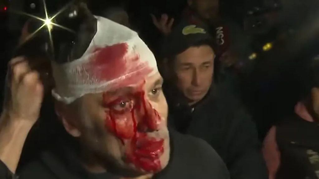 El periodista de América TV, Cristian Mercatante, recibió un botellazo en la cabeza este miércoles por la noche mientras cubría el acto de cierre de campaña del presidente Javier Milei en el partido de Moreno. Las primeras imágenes que se conocieron del hecho lo muestran con el rostro completamente ensangrentado.