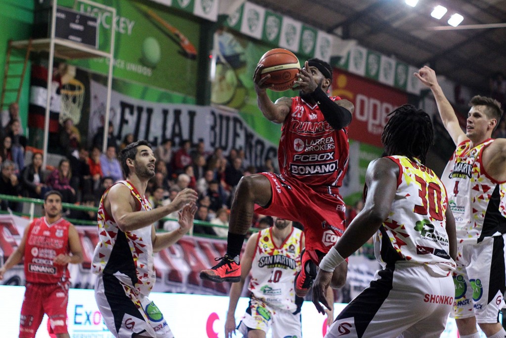 El enésimo rompimiento de Walter Baxley rodeado de la pasividad de los rivales. El estadounidense anotó 32 puntos y Quilmes llegó a 112. Foto: Maximiliano Gutiérrez (Prensa Quilmes)