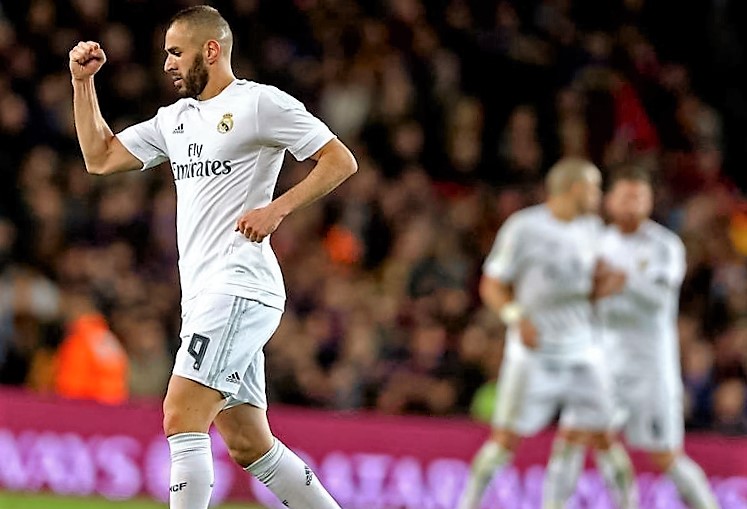 Benzema celebra su gol, el del transitorio empate en el clásico español. Foto: EFE.