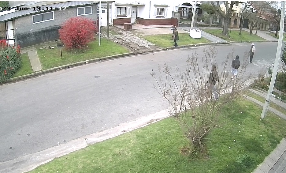 En la secuencia captada por la cámara de seguridad de una vivienda particular se observa cómo la mujer intenta cruzar de vereda al ver avanzar a los tres delincuentes. Sin embargo, no puede evitar que la arrinconen en el ingreso a otra casa y le exijan la entrega del teléfono.