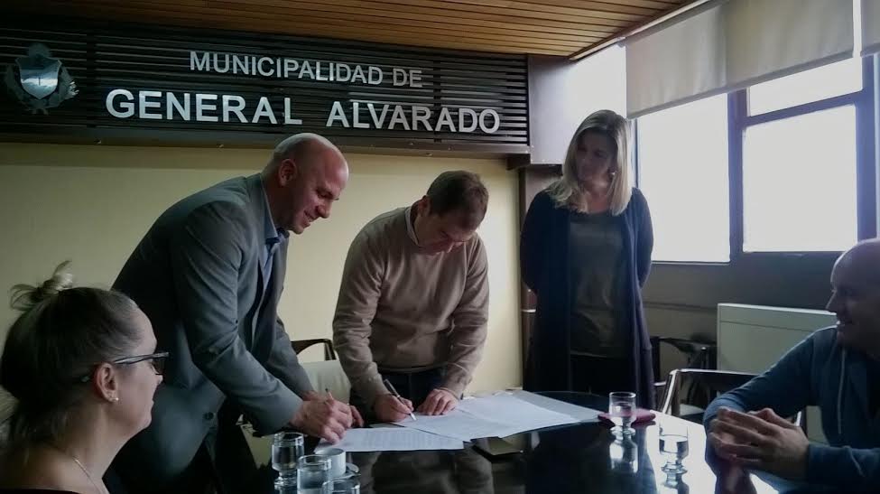 MIRAMAR (Corresponsal).- En la sala de audiencias del palacio comunal, se suscribió el convenio de articulación entre la Municipalidad de General Alvarado, representada por el intendente Germán Di Cesare, y el presidente de la Federación del Deporte Universitario Argentino (FeDUA), Emiliano Ojea, para la realización de los Juegos Universitarios Sudamericanos Buenos Aires 2016 (JUSBA), que tendrán como anfitrión a Miramar entre el 22 y el 27 del corriente mes.